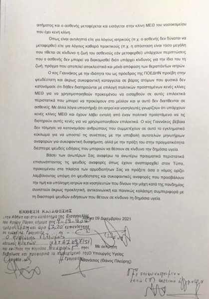 Ο Υπουργός Υγείας Θάνος Πλεύρης κατέθεσε ενώπιον του Εισαγγελέως του Αρείου Πάγου αναφορά αξιόποινων πράξεων κατά του προέδρου της ΠΟΕΔΗΝ Μιχάλη Γιαννάκου και παντός υπευθύνου που διακινεί ψευδείς και συκοφαντικές ειδήσεις για δήθεν ύπαρξη κλινών ΜΕΘ που κρατούνται για επιλεγμένα πρόσωπα και δεν διατίθενται στους ασθενείς.