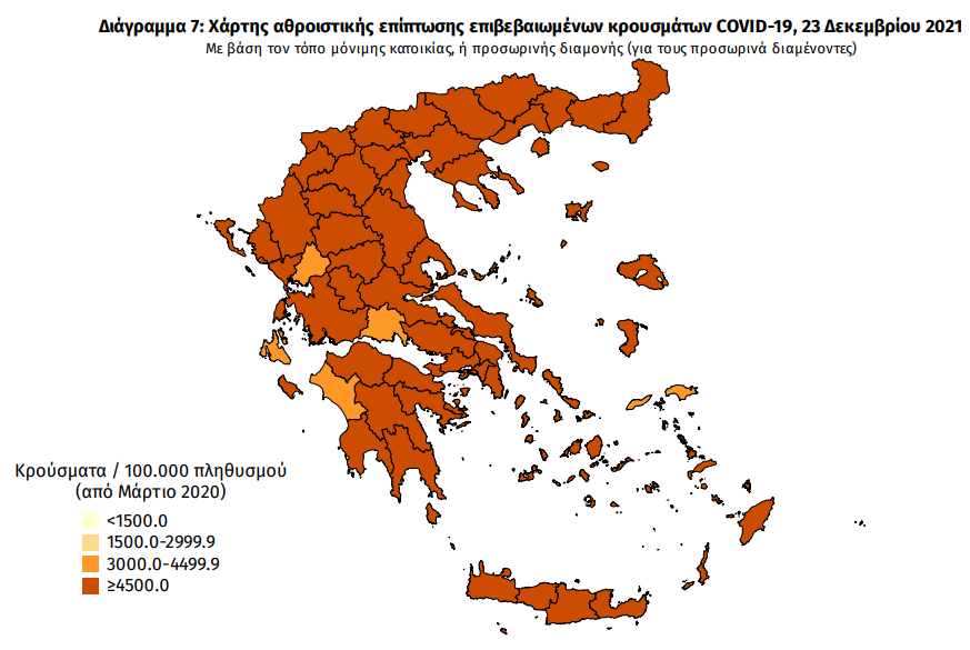 Ο χάρτης αποτυπώνει τη γεωγραφική κατανομή των συνολικών κρουσμάτων COVID-19 (από την αρχή της επιδημίας) ανά Περιφερειακή Ενότητα της χώρας, με βάση την δηλωθείσα διεύθυνση μόνιμης κατοικίας του ασθενούς, ή τη διεύθυνση προσωρινής διαμονής για τους τουρίστες και άλλους προσωρινά διαμένοντες στην Ελλάδα. Συμπεριλαμβάνονται τόσο κρούσματα με ιστορικό ταξιδίου («εισαγόμενα») όσο και κρούσματα με πιθανή εγχώρια μετάδοση.