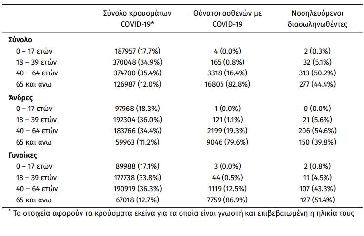 Οι νέοι θάνατοι ασθενών με COVID-19 είναι 94, ενώ από την έναρξη της επιδημίας έχουν καταγραφεί συνολικά 20.292 θάνατοι. Το 95.2% είχε υποκείμενο νόσημα ή/και ηλικία 70 ετών και άνω.