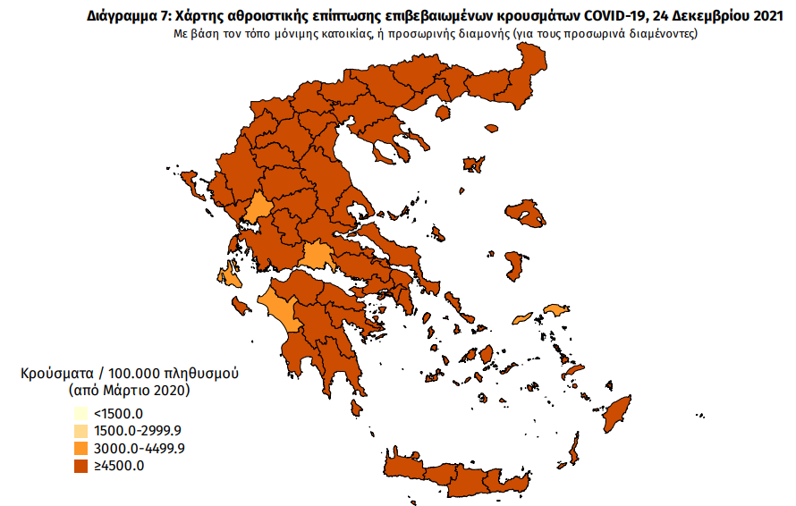 Ο χάρτης αποτυπώνει τη γεωγραφική κατανομή των συνολικών κρουσμάτων COVID-19 (από την αρχή της επιδημίας) ανά Περιφερειακή Ενότητα της χώρας, με βάση την δηλωθείσα διεύθυνση μόνιμης κατοικίας του ασθενούς, ή τη διεύθυνση προσωρινής διαμονής για τους τουρίστες και άλλους προσωρινά διαμένοντες στην Ελλάδα. Συμπεριλαμβάνονται τόσο κρούσματα με ιστορικό ταξιδίου («εισαγόμενα») όσο και κρούσματα με πιθανή εγχώρια μετάδοση.