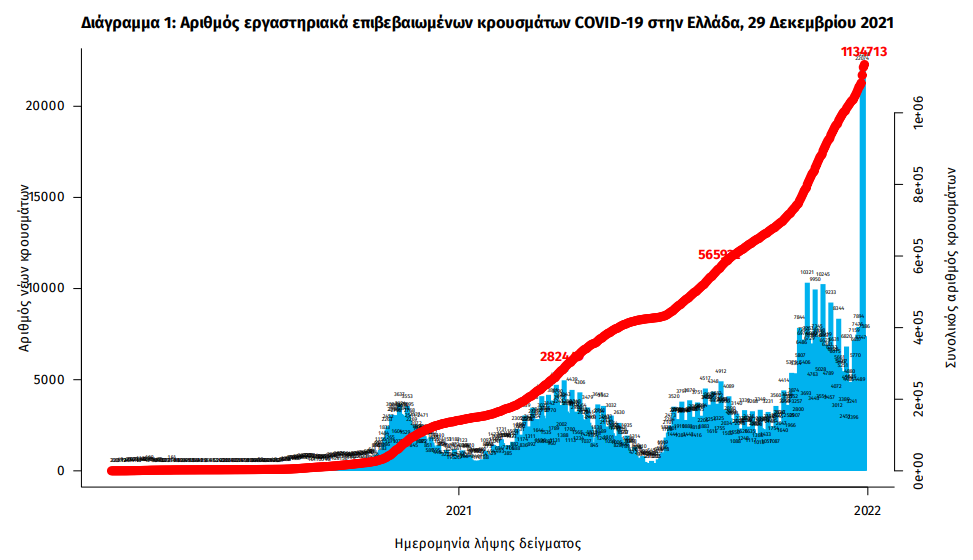 Τα νέα εργαστηριακά επιβεβαιωμένα κρούσματα της νόσου που καταγράφηκαν τις τελευταίες 24 ώρες είναι 28.828, εκ των οποίων 19 εντοπίστηκαν κατόπιν ελέγχων στις πύλες εισόδου της χώρας. Ο συνολικός αριθμός των κρουσμάτων ανέρχεται σε 1.134.713 (ημερήσια μεταβολή +2.6%), εκ των οποίων 50.4% άνδρες.