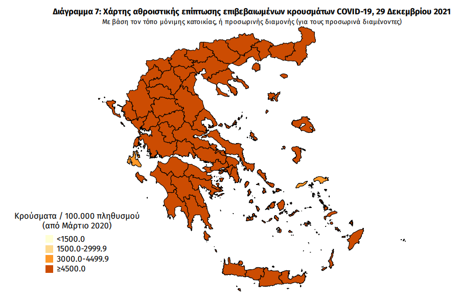 Ο χάρτης αποτυπώνει τη γεωγραφική κατανομή των συνολικών κρουσμάτων COVID-19 (από την αρχή της επιδημίας) ανά Περιφερειακή Ενότητα της χώρας, με βάση την δηλωθείσα διεύθυνση μόνιμης κατοικίας του ασθενούς, ή τη διεύθυνση προσωρινής διαμονής για τους τουρίστες και άλλους προσωρινά διαμένοντες στην Ελλάδα. Συμπεριλαμβάνονται τόσο κρούσματα με ιστορικό ταξιδίου («εισαγόμενα») όσο και κρούσματα με πιθανή εγχώρια μετάδοση.