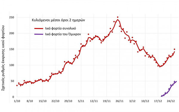 Η αναστροφή της πορείας αποκλιμάκωσης συνέπεσε χρονικά με την εμφάνιση στα λύματα του στελέχους Όμικρον, στις 19 Δεκεμβρίου και από την ημέρα εκείνη η γραμμή της ανόδου του συνολικού ιικού φορτίου είναι παρόμοια με την αντίστοιχη γραμμή ανόδου του Όμικρον.