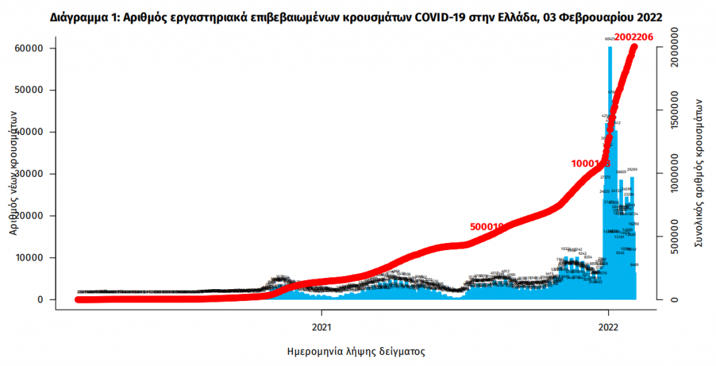 Τα νέα εργαστηριακά επιβεβαιωμένα κρούσματα της νόσου που καταγράφηκαν τις τελευταίες 24 ώρες είναι 17.662, εκ των οποίων 53 εντοπίστηκαν κατόπιν ελέγχων στις πύλες εισόδου της χώρας. Ο συνολικός αριθμός των κρουσμάτων ανέρχεται σε 2.002.206 (ημερήσια μεταβολή +0.9%), εκ των οποίων 49.8% άνδρες.