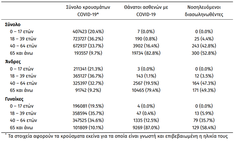 Οι νέοι θάνατοι ασθενών με COVID-19 είναι 106, ενώ από την έναρξη της επιδημίας έχουν καταγραφεί συνολικά 23.833 θάνατοι. Το 95.1% είχε υποκείμενο νόσημα ή/και ηλικία 70 ετών και άνω.