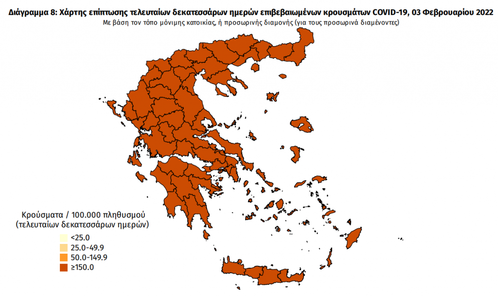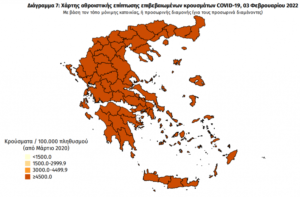 Ο χάρτης αποτυπώνει τη γεωγραφική κατανομή των συνολικών κρουσμάτων COVID-19 (από την αρχή της επιδημίας) ανά Περιφερειακή Ενότητα της χώρας, με βάση την δηλωθείσα διεύθυνση μόνιμης κατοικίας του ασθενούς, ή τη διεύθυνση προσωρινής διαμονής για τους τουρίστες και άλλους προσωρινά διαμένοντες στην Ελλάδα. Συμπεριλαμβάνονται τόσο κρούσματα με ιστορικό ταξιδίου («εισαγόμενα») όσο και κρούσματα με πιθανή εγχώρια μετάδοση.