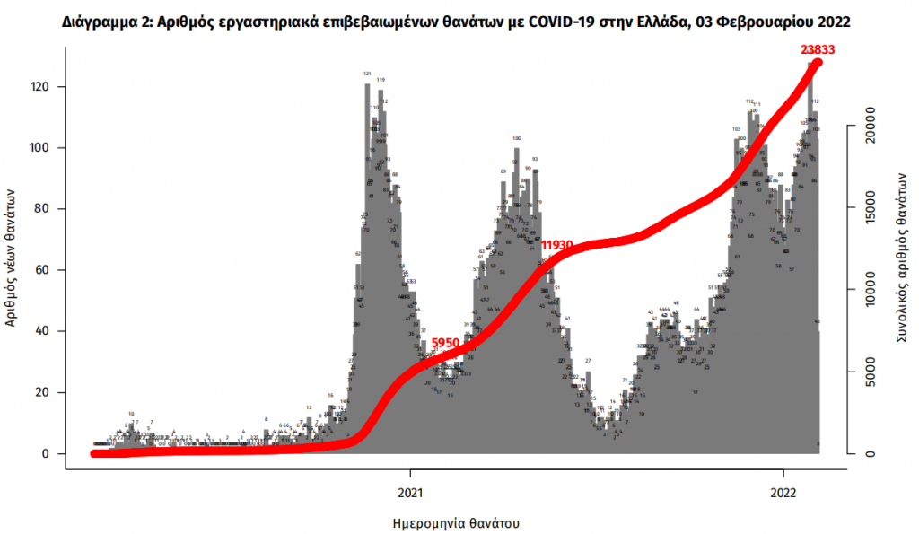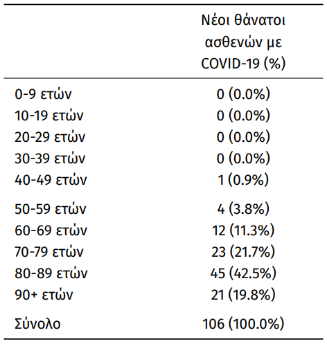 Οι νέοι θάνατοι ασθενών με COVID-19 είναι 106, ενώ από την έναρξη της επιδημίας έχουν καταγραφεί συνολικά 23.833 θάνατοι. Το 95.1% είχε υποκείμενο νόσημα ή/και ηλικία 70 ετών και άνω.