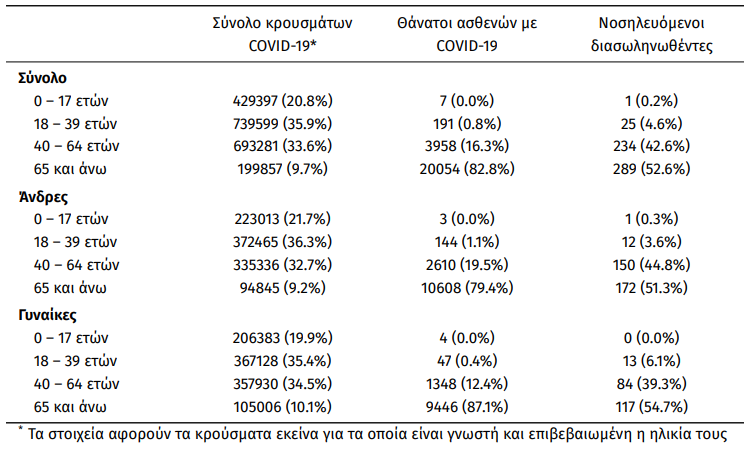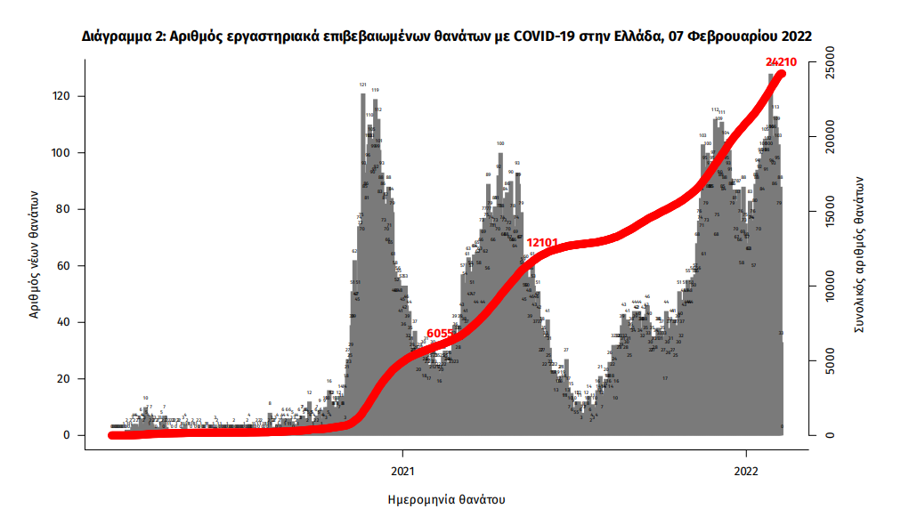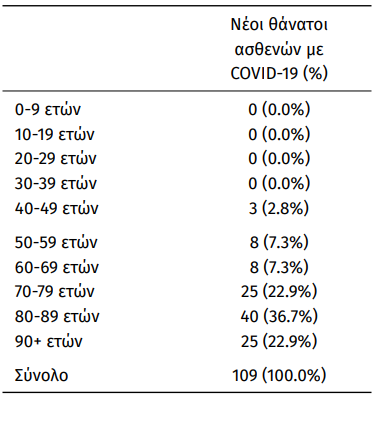 Οι νέοι θάνατοι ασθενών με COVID-19 είναι 109, ενώ από την έναρξη της επιδημίας έχουν καταγραφεί συνολικά 24.210 θάνατοι. Το 95.1% είχε υποκείμενο νόσημα ή/και ηλικία 70 ετών και άνω.
