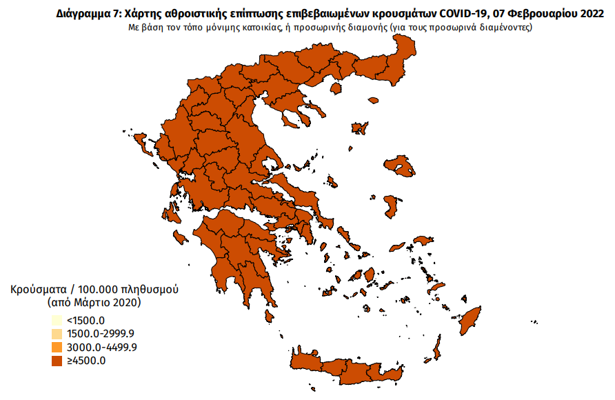 Ο χάρτης αποτυπώνει τη γεωγραφική κατανομή των συνολικών κρουσμάτων COVID-19 (από την αρχή της επιδημίας) ανά Περιφερειακή Ενότητα της χώρας, με βάση την δηλωθείσα διεύθυνση μόνιμης κατοικίας του ασθενούς, ή τη διεύθυνση προσωρινής διαμονής για τους τουρίστες και άλλους προσωρινά διαμένοντες στην Ελλάδα. Συμπεριλαμβάνονται τόσο κρούσματα με ιστορικό ταξιδίου («εισαγόμενα») όσο και κρούσματα με πιθανή εγχώρια μετάδοση.