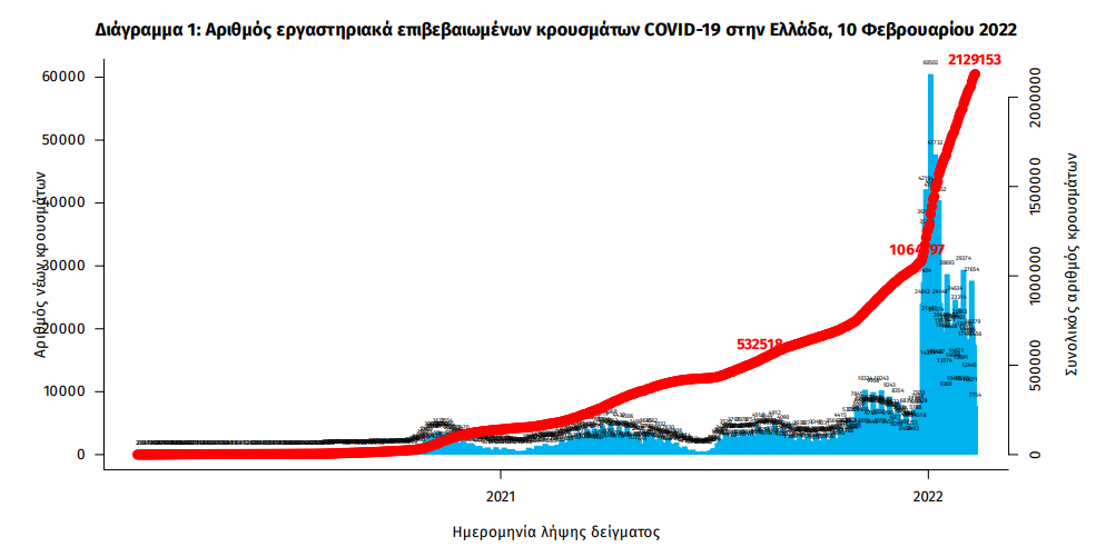 Τα νέα εργαστηριακά επιβεβαιωμένα κρούσματα της νόσου που καταγράφηκαν τις τελευταίες 24 ώρες είναι 19.154, εκ των οποίων 64 εντοπίστηκαν κατόπιν ελέγχων στις πύλες εισόδου της χώρας. Ο συνολικός αριθμός των κρουσμάτων ανέρχεται σε 2.129.153 (ημερήσια μεταβολή +0.9%), εκ των οποίων 49.7% άνδρες.