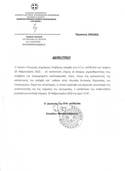 «Παρά την υποστήριξη την οποία περιέλαβε και μηχανική υποστήριξη της αναπνευστικής και της νεφρικής του λειτουργίας, η κατάστασή του επιδεινώθηκε ραγδαία και κατέληξε σήμερα 25 Φεβρουαρίου ώρα 13.35» αναφέρει η ανακοίνωση του νοσοκομείου.