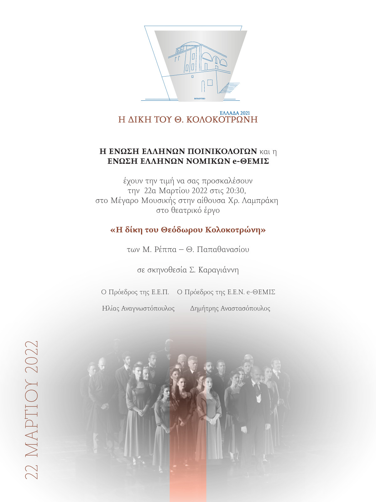 Η Ενωση Ελλήνων Ποινικολόγων και η Ενωση Ελλήνων Νομικών e-Θέμις απευθύνουν πρόσκληση για την παράσταση των Μ. Ρέππα – Θ. Παπαθανασίου «Η δίκη του Θεόδωρου Κολοκοτρώνη», σε σκηνοθεσία Σταύρου Καραγιάννη.