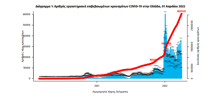 Τα νέα εργαστηριακά επιβεβαιωμένα κρούσματα της νόσου που καταγράφηκαν τις τελευταίες 24 ώρες είναι 21.102 , εκ των οποίων 14 εντοπίστηκαν κατόπιν ελέγχων στις πύλες εισόδου της χώρας. Ο συνολικός αριθμός των κρουσμάτων ανέρχεται σε 3.051.531 (ημερήσια μεταβολή +0.7%), εκ των οποίων 49.1% άνδρες. Με βάση τα επιβεβαιωμένα κρούσματα των τελευταίων 7 ημερών, 181 θεωρούνται σχετιζόμενα με ταξίδι από το εξωτερικό και 1.778 είναι σχετιζόμενα με ήδη γνωστό κρούσμα.