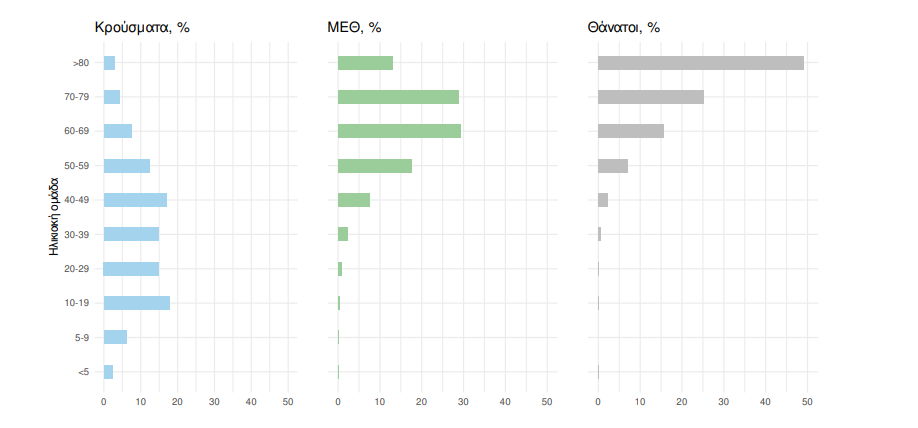 Οι εισαγωγές νέων ασθενών Covid-19 στα νοσοκομεία της επικράτειας είναι 485 (ημερήσια μεταβολή +6.13%). Ο μέσος όρος εισαγωγών του επταημέρου είναι 441 ασθενείς. Η διάμεση ηλικία των κρουσμάτων είναι 36 έτη (εύρος 0.2 έως 112 έτη), ενώ η διάμεση ηλικία των θανόντων είναι 79 έτη (εύρος 0.2 έως 106 έτη).