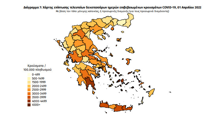 Γεωγραφική διασπορά: Ο χάρτης αποτυπώνει τη γεωγραφική κατανομή των κρουσμάτων COVID-19 των τελευταίων 14 ημερών ανά Περιφερειακή Ενότητα της χώρας, με βάση την δηλωθείσα διεύθυνση μόνιμης κατοικίας του ασθενούς, ή τη διεύθυνση προσωρινής διαμονής για τους τουρίστες και άλλους προσωρινά διαμένοντες στην Ελλάδα. Συμπεριλαμβάνονται τόσο κρούσματα με ιστορικό ταξιδίου (“εισαγόμενα”) όσο και κρούσματα με πιθανή εγχώρια μετάδοση.