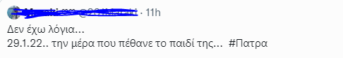 Ενδεικτικά ένας από τους χρήστες στο twitter γράφει: «Δεν έχω λόγια 29.1.22 την ημέρα που πέθανε το παιδί της».