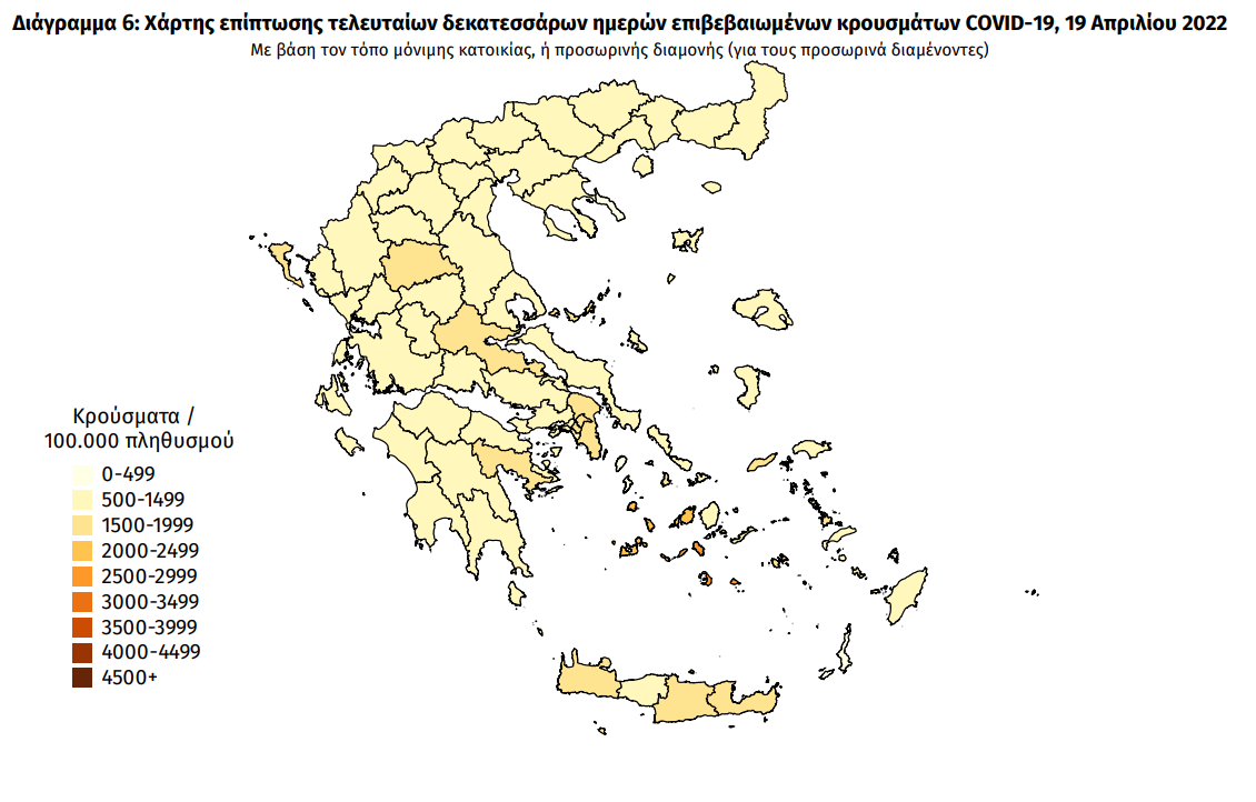 Ο χάρτης αποτυπώνει τη γεωγραφική κατανομή των κρουσμάτων COVID-19 των τελευταίων 14 ημερών ανά Περιφερειακή Ενότητα της χώρας, με βάση την δηλωθείσα διεύθυνση μόνιμης κατοικίας του ασθενούς, ή τη διεύθυνση προσωρινής διαμονής για τους τουρίστες και άλλους προσωρινά διαμένοντες στην Ελλάδα. Συμπεριλαμβάνονται τόσο κρούσματα με ιστορικό ταξιδίου (“εισαγόμενα”) όσο και κρούσματα με πιθανή εγχώρια μετάδοση.