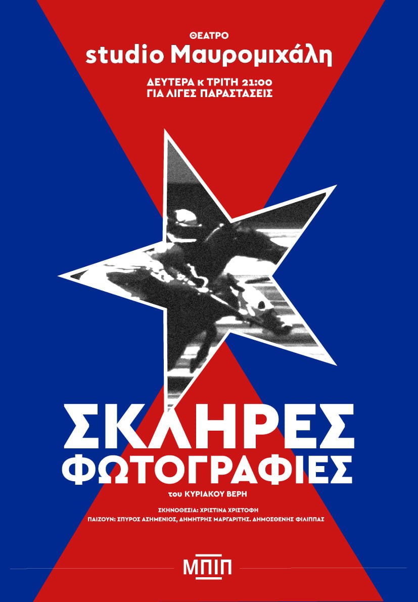 Το έργο «Σκληρές φωτογραφίες» του Κυριάκου Βέρη ανεβαίνει στο Studio Μαυρομιχάλη κάθε Δευτέρα και Τρίτη σε σκηνοθεσία Χριστίνας Χριστοφή. Τους κεντρικούς ρόλους υποδύονται οι ηθοποιοί Δημοσθένης Φίλιππας, Σπύρος Ασημένιος και Δημήτρης Μαργαρίτης.