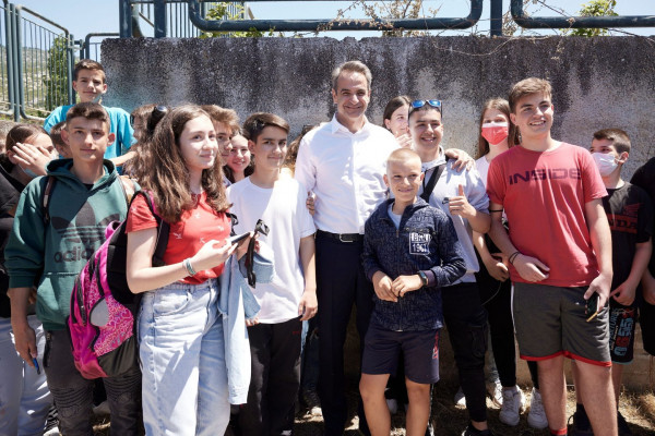 Ο κ. Μητσοτάκης είχε την ευκαιρία να συνομιλήσει με μαθητές του γυμνασίου του χωριού και να φωτογραφηθεί μαζί τους.
