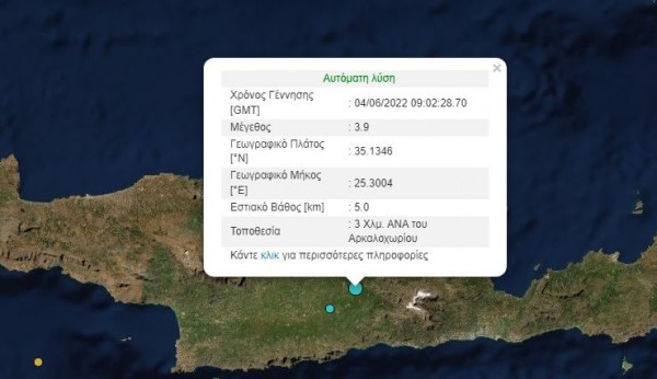 Ακόμα ένας σεισμός σημειώθηκε στο Αρκαλοχώρι της Κρήτης. Σύμφωνα με την αυτόματη λύση του Γεωδυναμικού Ινστιτούτου ο σεισμός είχε μέγεθος 3,9 βαθμούς της κλίμακας Ρίχτερ, ενώ είχε μικρό εστιακό βάθος, μόλις 5χλμ.