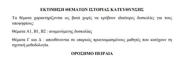 Τα θέματα στην Ιστορία κρίνονται βατά που απευθύνονται σε καλά προετοιμασμένους μαθητές και στην Οικονομία βατά και αναμενόμενα. Αντιθέτως περισσότερο φαίνεται πως δυσκόλεψαν τους υποψηφίους τα θέματα στη Φυσική με το τελευταίο θέμα να απαιτεί πολύ χρόνο.