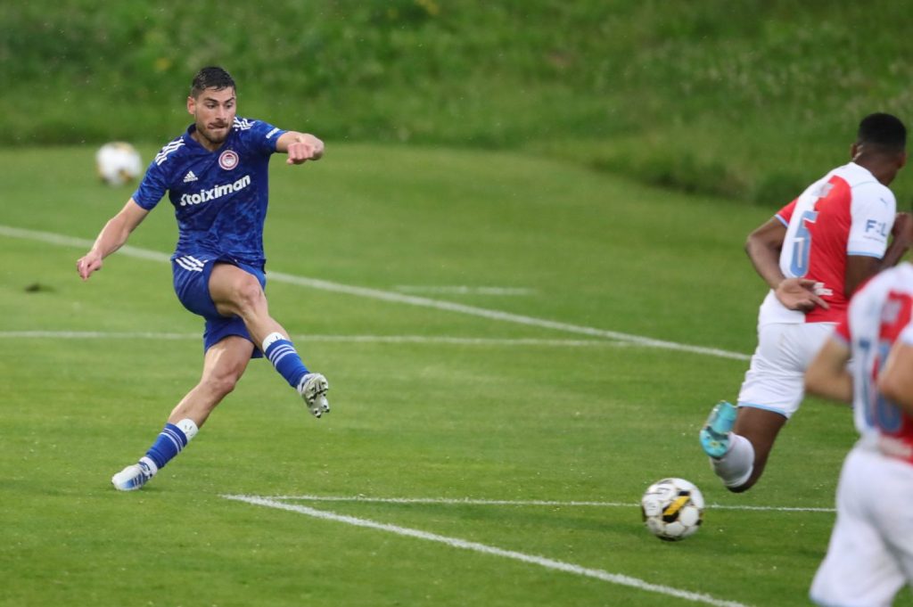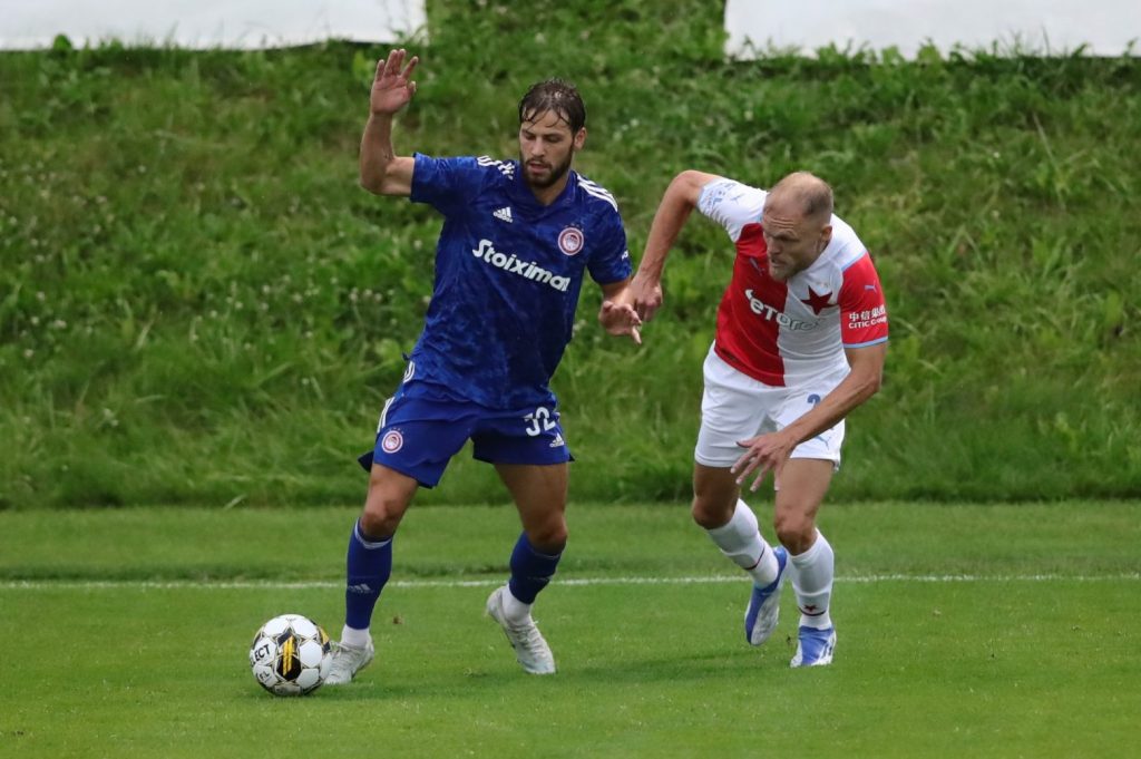 Οι Ερυθρόλευκοι ήταν καλύτεροι στο μεγαλύτερο μέρος της αναμέτρησης με την τσέχικη ομάδα και προηγήθηκαν στο 34’ με τον Ολεγκ Ρέαμπτσιουκ, μετά το σουτ του Κούντε, με την Σλάβια Πράγας να ισοφαρίζει στο 43’ με ένα τυχερό γκολ του Ουόσου.