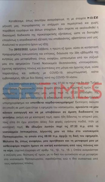 «Στο νοσοκομείο Παπαγεωργίου με εισήγαγαν αρχικώς περί τις 8.40 π.μ., αντί σε γυναικολογική κλινική για να γεννήσω, σε Covid -19 κλινική στο Τμήμα Επειγόντων Περιστατικών (ΤΕΠ) και μια ώρα μετά, ήτοι στις 9.40 π.μ., της ίδιας ημέρας, με εισήγαγαν στη μαιευτική κλινική για επείγουσα, άμεση χειρουργική επέμβαση καισαρικής τομής, όπου και τελικώς μια ώρα μετά, ήτοι στις 10.30 π.μ. γέννησα με καισαρική τομή ένα άσφυγμο, άρρεν, ώριμο νεογνό υπό ισχιακή προβολή, έχοντας ήδη υποστεί εκ της εγκληματικής αρνήσεως, αλλά και της καθυστερήσεως των δύο νοσοκομείων, αποκόλληση πλακούντα και ρήξη μήτρας» συμπληρώνει η μητέρα.