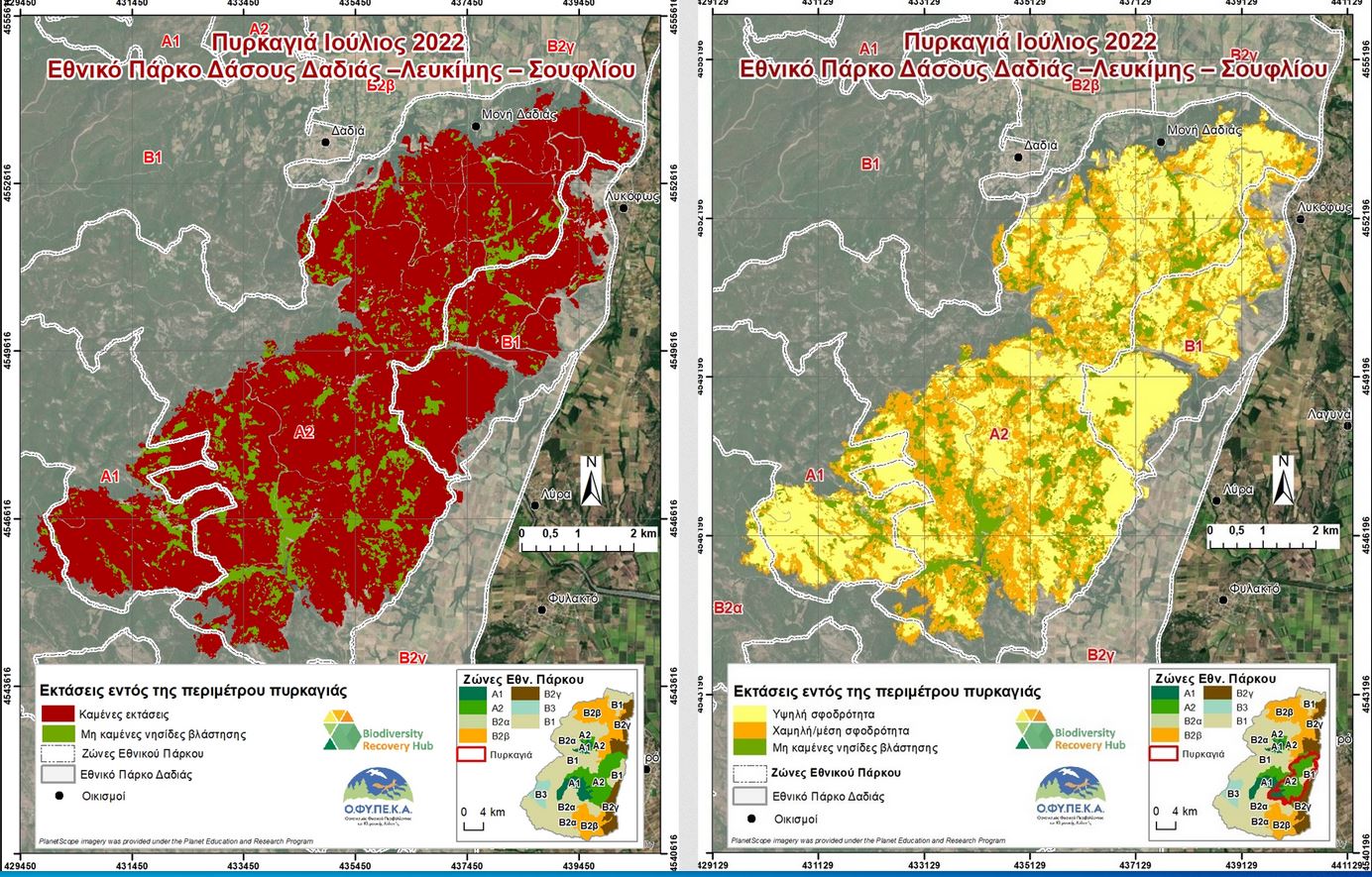Το υψηλό ποσοστό (50% της πληγείσας περιοχής) από άκαυτες νησίδες και χαμηλής/μέτριας σφοδρότητας πυρκαγιάς αφήνει ένα μήνυμα αισιοδοξίας για τη διατήρηση της βιοποικιλότητας και των σπάνιων αρπακτικών και πτωματοφάγων ειδών στην περιοχή. Ο Ο.ΦΥ.ΠΕ.Κ.Α. ήδη καταρτίζει ένα ολοκληρωμένο σχέδιο μεταπυρικής αποκατάστασης της περιοχής το οποίο αναμένεται να αρχίσει να υλοποιείται τις επόμενες ημέρες. Τα αποτελέσματα της χαρτογράφησης θα επαληθευτούν και θα εμπλουτισθούν ως προς τη θεματική τους πληροφορία από εκτεταμένες εργασίες πεδίου.