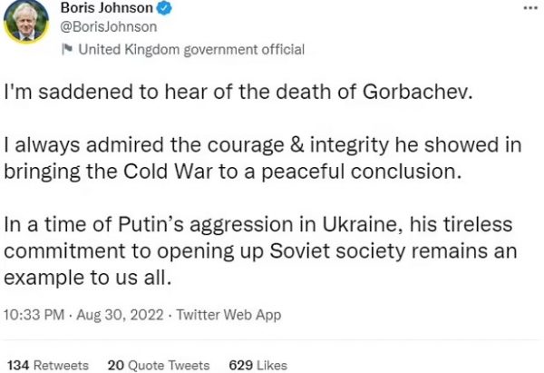 Ο Μπόρις Τζόνσον, ο απερχόμενος πρωθυπουργός της Βρετανίας, δήλωσε ότι «πάντα θαύμαζα το θάρρος και την ακεραιότητα που επέδειξε για την ειρηνική λήξη του ψυχρού πολέμου».