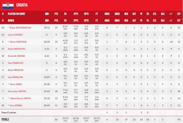 Για τους Κροάτες που ήταν πολύ καλοί στο δεύτερο μέρος και έφεραν στα όρια της την Εθνική που έπαιζε χωρίς Παπαγιάννη και Κώστα Αντετοκούνμπο, κορυφαίοι ήταν οι Μπόγιαν Μπογκντάνοβιτς (19 πόντοι, 7 ριμπάουντ), Τζαλίν Σμιιθ (23 πόντοι, 5 ριμπάουντ, 4 ασίστ), Ίβιτσα Ζούμπατς (11 πόντοι) και Κρούνο Σιμόν (18 πόντοι).