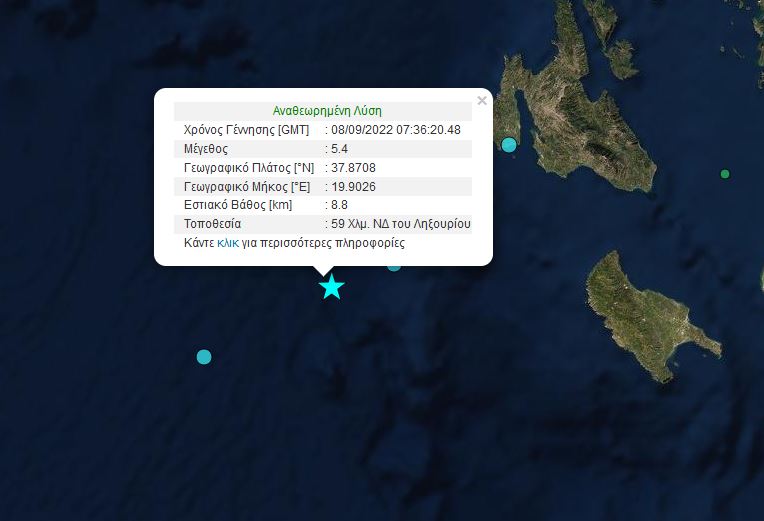 Ισχυρός σεισμός 5,4 Ρίχτερ σημειώθηκε στις 10.36 το πρωί της Πέμπτης στα ανοιχτά της Κεφαλονιάς, 57 χιλιόμετρα νοτιοδυτικά του Ληξουρίου, σύμφωνα το Γεωδυναμικό Ινστιτούτου του Εθνικού Αστεροσκοπείου Αθηνών.
