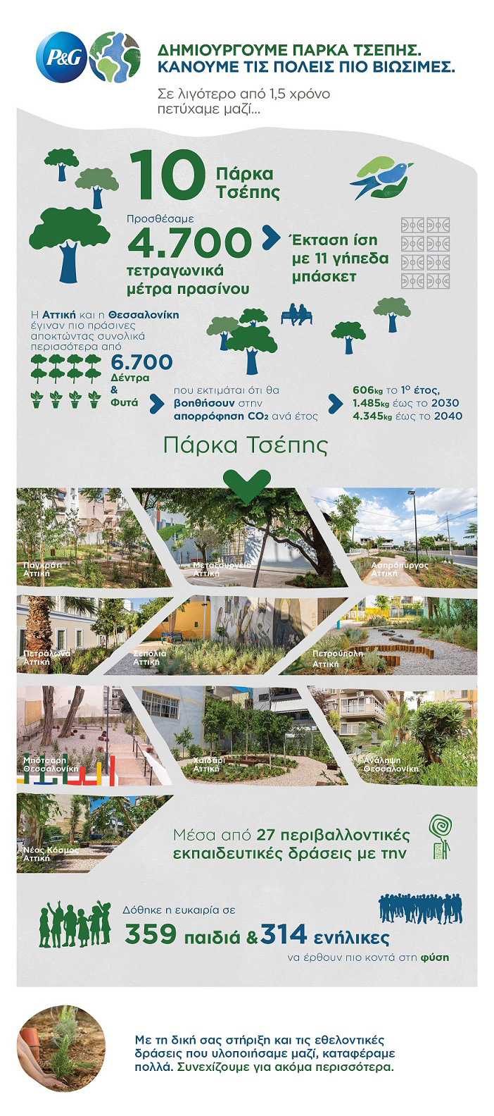 Τον Ιανουάριο του 2021, εν μέσω πανδημίας, ξεκίνησε μια προσπάθεια να δημιουργηθούν χώροι πρασίνου σε πυκνοκατοικημένες γειτονιές, με στόχο την αναβάθμιση, αισθητική και ουσιαστική των αστικών μας κέντρων. Ενάμιση χρόνο μετά, η P&G, πιστή στη δέσμευση αυτή, ολοκλήρωσε 10 πάρκα τσέπης σε Αθήνα και Θεσσαλονίκη, συνολικής έκτασης 4.700 τ.μ., στα οποία προστέθηκαν συνολικά 6.700 δέντρα και φυτά.