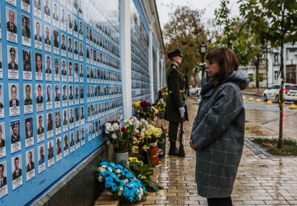 Στο Τείχος της Μνήμης των Πεσόντων από το 2014 Μαχητών, στο Κίεβο, ξέρει πως δεν θα λείψουν ούτε μέρα τα λουλούδια, γιατί όσοι επιζούν θα τιμούν, ακόμα κι αν γύρω πέφτουν βόμβες, αυτούς τους εικοσάχρονους στρατιώτες που χάθηκαν τόσο νωρίς.