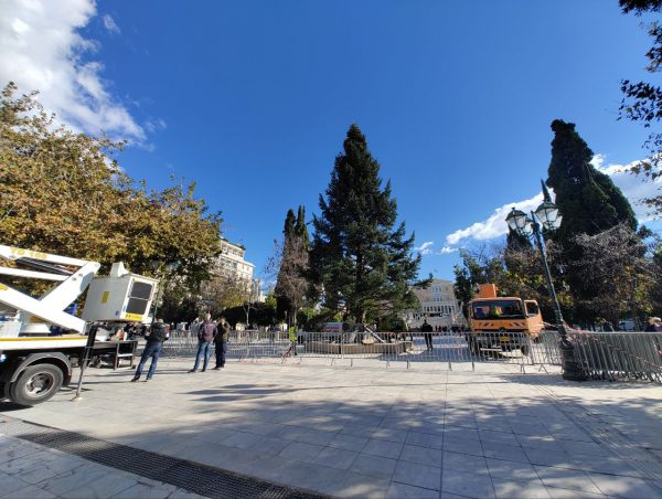 Το φετινό χριστουγεννιάτικο δέντρο έχει στηθεί και πρόκειται να στολιστεί σήμερα, αφού η βάση ήταν ήδη τοποθετημένη και οι τεχνικοί στο σημείο σε ετοιμότητα όταν έφτασε το έλατο.