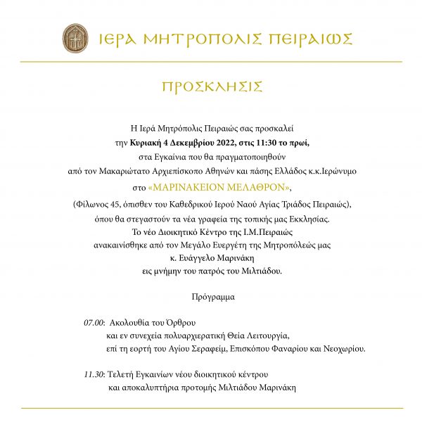 Την προσεχή Κυριακή 4 Δεκεμβρίου 2022, και ώρα 11:30, θα λάβουν χώρα τα εγκαίνια στο «Μαρινάκειον Μέλαθρον», όπου θα στεγαστούν τα νέα γραφεία της Ιεράς Μητρόπολης Πειραιώς.