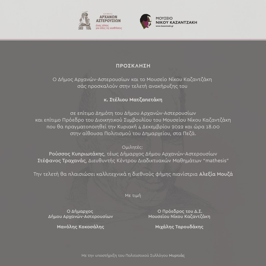 Στην τελετή ο Στέλιος Ματζαπετάκης θα ανακηρυχθεί επίτιμος δημότης του Δήμου Αρχανών Αστερουσίων και επίτιμος πρόεδρος του Διοικητικού Συμβουλίου του Μουσείου Νίκου Καζαντζάκη.