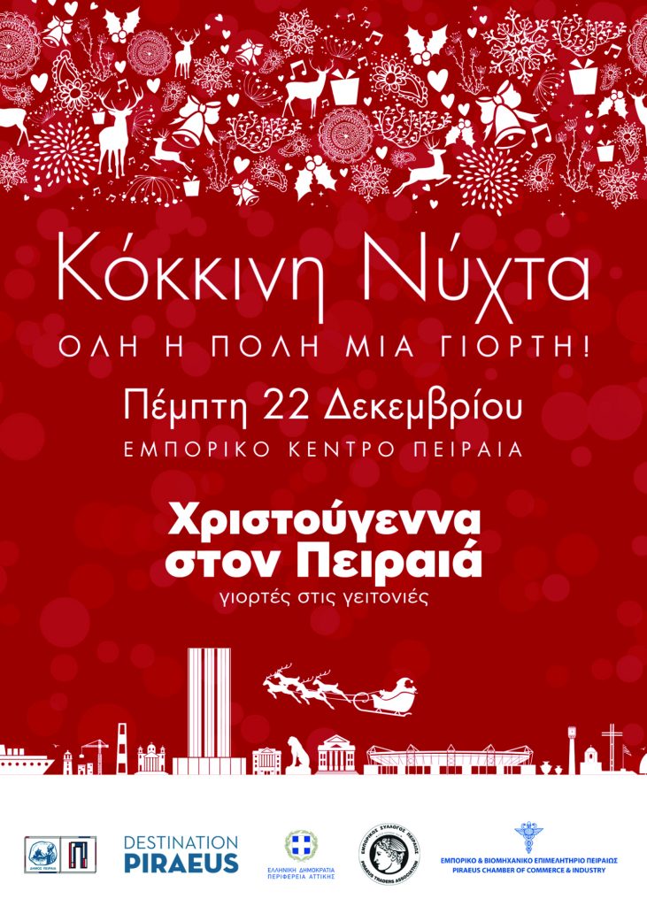 Σε συνεργασία με τον Εμπορικό Σύλλογο Πειραιά, την Πέμπτη 22 Δεκεμβρίου έρχεται για 2η χρονιά η «Κόκκινη Νύχτα», μια χριστουγεννιάτικη γιορτή με πολλές εκπλήξεις, δεκάδες δράσεις στο εμπορικό κέντρο της πόλης, ελκυστικές προσφορές και ειδικές εκπτώσεις. Στην «Κόκκινη Νύχτα», τα καταστήματα του Πειραιά θα παραμείνουν ανοιχτά έως τις 12 το βράδυ, μετατρέποντας το κέντρο της πόλης σε «κέντρο εξωστρέφειας» της φετινής εορταστικής περιόδου.