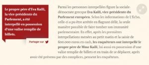 Οι βελγικές Αρχές πραγματοποίησαν την Παρασκευή 9 Δεκεμβρίου, τουλάχιστον 17 έρευνες σε διάφορους δήμους των Βρυξελλών, μεταξύ των οποίων και στην οικία της κ. Εύας Καϊλή. Σύμφωνα με πληροφορίες της βελγικής εφημερίδας “L’Echo”, η κ. Καϊλή πέρασε τη νύχτα στο κρατητήριο, καθώς στο σπίτι της βρέθηκαν «τσάντες με χαρτονομίσματα». Η ίδια εφημερίδα αναφέρει ότι η κ. Καϊλή συνελήφθη επ’ αυτοφώρω, ο οποίος είναι και ο μόνος δυνατός τρόπος να καταρριφθεί η βουλευτική ασυλία. Οι ανακριτές συνέλαβαν και τον πατέρα της κ. Καϊλή, ο οποίος προσπάθησε να διαφύγει με βαλίτσα γεμάτη χαρτονομίσματα.