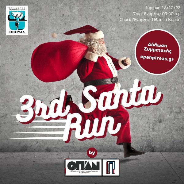 Ο Οργανισμός Πολιτισμού, Αθλητισμού και Νεολαίας του Δήμου Πειραιά με την υποστήριξη του Συλλόγου Δρομέων Υγείας Πειραιά, διοργανώνει για τρίτη συνεχόμενη χρονιά, το Santa Run, τον πιο διασκεδαστικό και Χριστουγεννιάτικο «αγώνα» τρεξίματος την Κυριακή 18 Δεκεμβρίου.