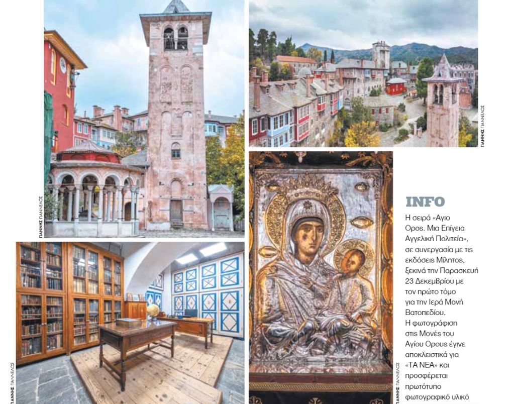 «Ετσι λαμπρές φαντάζανε οι ζωγραφιές του Πανσέληνου στην ολονυκτία του “Αξιον εστί”, μέσα στην αχλύ των κεριών των πολυελαίων που χορεύανε… Ενιωσα το ίδιο ρίγος σαν να μου αποκαλυπτότανε το απόλυτο, όπως μπροστά στις ζωγραφιές του Ρέμπραντ, του Γκρέκο, του Βελάσκεθ, ή ακούγοντας Μπαχ και Μότσαρτ, ή περιδιαβάζοντας τον Ηνίοχο, τη Νεφερτίτη και τα γλυπτά της Ολυμπίας». Αυτές ήταν οι εντυπώσεις του αείμνηστου Χρόνη Μπότσογλου από την επίσκεψή του στο Αγιον Ορος το 1988, όπως τις κατέγραψε στο ημερολόγιό του. Αντίστοιχες εικόνες, εντυπώσεις και συναισθήματα για την πολιτεία του μοναχισμού «ζωντανεύουν» μέσα στον πλούσια εικονογραφημένο τόμο με τα ιερά κειμήλια και τους κρυμμένους θησαυρούς της Μονής Βατοπεδίου, τον οποίο προσφέρουν την ερχόμενη Παρασκευή «ΤΑ ΝΕΑ». Πρόκειται για τον πρώτο σταθμό της σειράς «Αγιο Ορος. Μια Επίγεια Αγγελική Πολιτεία», που δημιουργήθηκε σε συνεργασία με τις εκδόσεις Μίλητος, σε επιμέλεια του παλαιογράφου Αγαμέμνονα Τσιλίκα, αποκλειστικά για τους αναγνώστες των «ΝΕΩΝ».