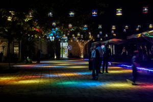 Με πρώτη ύλη το φως και το χρώμα η ομάδα Beforelight – oι περισσότεροι τους γνωρίζουμε από τις επεμβάσεις τους στην οδό Πιττάκη στου Ψυρρή, αλλά και τις εγκαταστάσεις τους στο Κέντρο Πολιτισμού Ίδρυμα Σταύρος Νιάρχος κατά την περίοδο των Χριστουγέννων – για αυτή την ξεχωριστή επέτειο αποφάσισε να αποδομήσει το κονσερβοκούτι και με χρωματιστούς δίσκους πλέξιγκλας – στο πλαίσιο και των εικαστικών εργαστηρίων του Φουγάρου- να δημιουργήσει σχεδόν 80 φαναράκια. Τα φωτιστικά αυτά βρήκαν τη θέση τους στο Παρκάκι και την Πλατεία του Φουγάρου,γύρω από τα οποία αναπτύσσονται εκθεσιακοί χώροι, βιβλιοθήκες, εικαστικά εργαστήρια, καφέ και εστιατόρια, δημιουργώντας καθώς κρέμονται από ψηλά πολύχρωμα σχέδια στο δάπεδο.