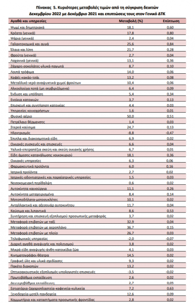 Η αύξηση του Γενικού ΔΤΚ κατά 7,2% τον μήνα Δεκέμβριο 2022, σε σύγκριση με τον αντίστοιχο Δείκτη του Δεκεμβρίου 2021, προήλθε κυρίως από τις μεταβολές στις ακόλουθες ομάδες αγαθών και υπηρεσιών: