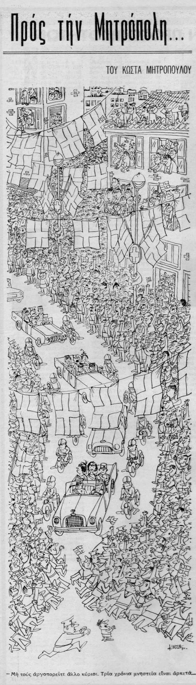 »Γκρίνιασες, ω μέγιστε γκρινιάρη, όταν αποκλείσθηκε ολόκληρη η λεωφόρος Συγγρού λόγω της αφίξεως της ωραιοτάτης νύμφης και της βασιλικής οικογένειάς της επειδή αποκόπηκε συγκοινωνιακώς η πρωτεύουσά μας με όλα τα παραθαλάσσια προάστια.