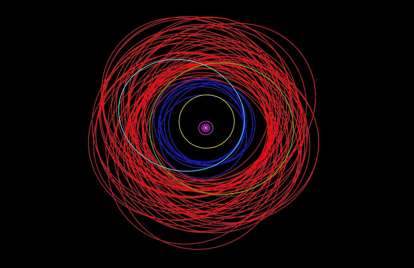Κάθε χρωματιστή γραμμή αντιστοιχεί στην τροχιά ενός δορυφόρου του Δία. Το διάγραμμα δεν είναι ενημερωμένο με τις τελευταίες ανακαλύψεις (Scott Sheppard)