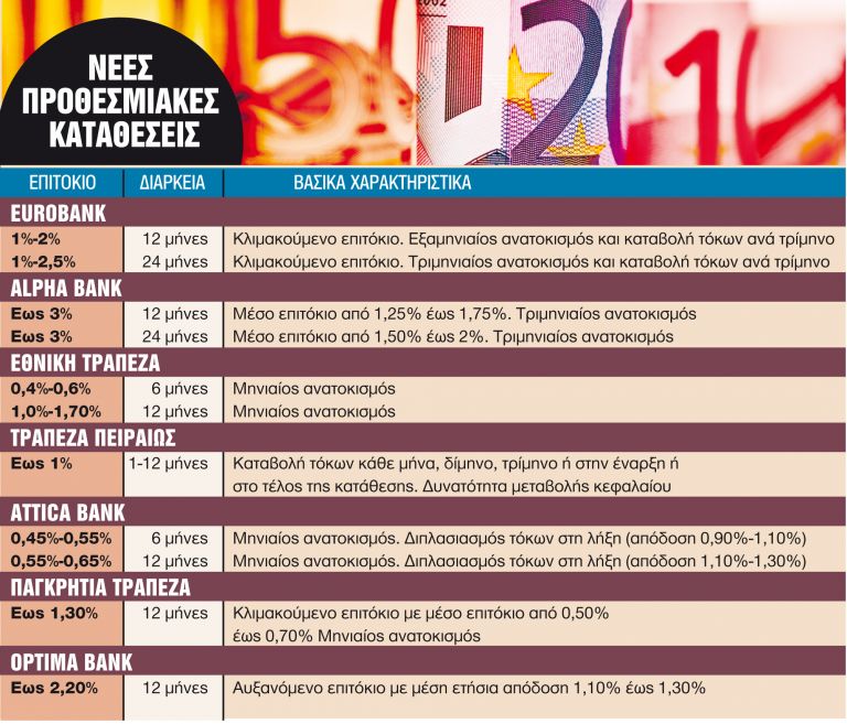 Η Eurobank ανακοίνωσε δύο προθεσμιακές καταθέσεις, 12 και 24 μηνών, με κλιμακούμενο επιτόκιο έως 2,5% και νέο αμοιβαίο κεφάλαιο 5ετούς διάρκειας με επιδιωκόμενο μέρισμα 3,10%. Λίγη ώρα μετά, έρχεται η «απάντηση» από την Alpha Bank, η οποία αύξησε τα επιτόκια του προϊόντος που είχε λανσάρει τον Ιανουάριο, το οποίο, επίσης, στηρίζεται σε κλιμακούμενο επιτόκιο. Αυτή τη φορά το όριο φτάνει μέχρι το 3%. Η Εθνική Τράπεζα ανανέωσε τα επιτόκια για την προθεσμιακή κατάθεση Μηνιαίο που φτάνουν το 1,70%, αλλά με μηνιαίο ανατοκισμό.
