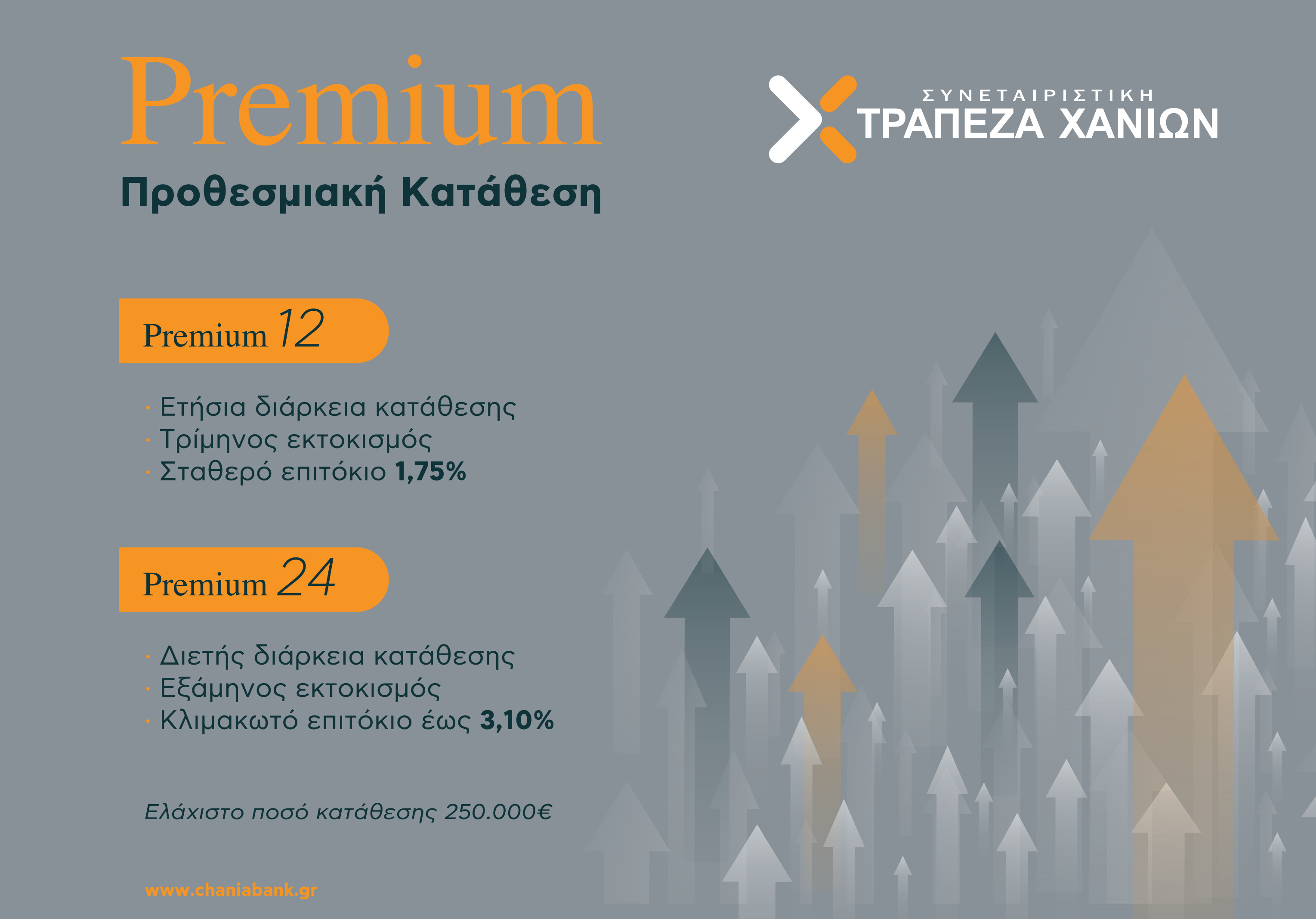 Περισσότερες πληροφορίες για τις Premium Προθεσμιακές Καταθέσεις είναι διαθέσιμες στο www.chaniabank.gr και σε όλα τα καταστήματα του δικτύου της Συνεταιριστικής Τράπεζας Χανίων.