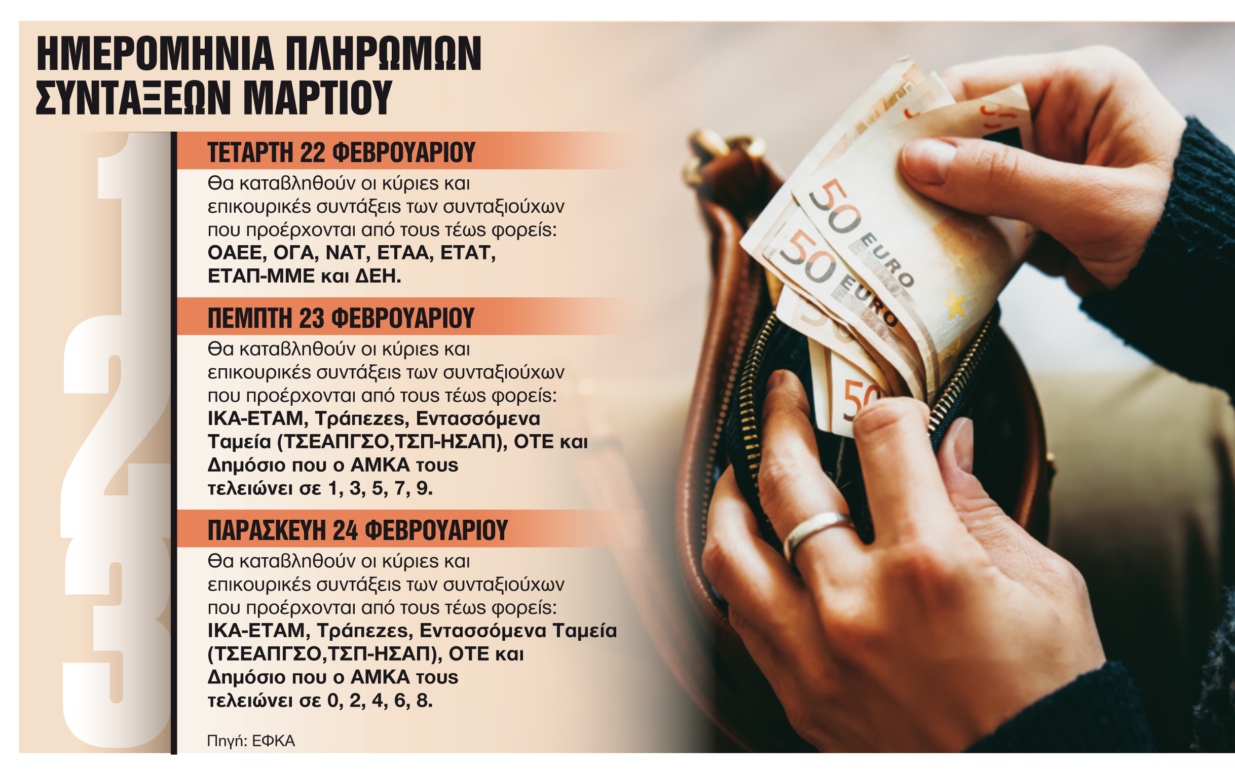 Τρεις πληρωμές για χιλιάδες συνταξιούχους έχουν προγραμματιστεί από τον ΕΦΚΑ μέχρι τα τέλη Μαρτίου. Οι δικαιούχοι θα λάβουν πληρωμή των συντάξεων Μαρτίου με αναδρομικά, προκαταβολή επικουρικής σύνταξης, καθώς και επίδομα προσωπικής διαφοράς. Ειδικότερα: