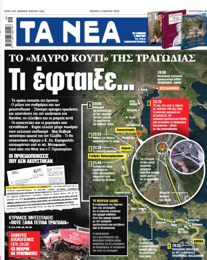 Στο CNN δημοσιεύτηκε το πρωτοσέλιδο των «Νέων» της Πέμπτης 2 Μαρτίου για τα αίτια της τραγωδίας. Το αμερικανικό δίκτυο, όπως και μέσα ενημέρωσης από όλο τον κόσμο, έχουν εκτενή ρεπορτάζ για τα Τέμπη, για τη σύγκρουση των τρένων, για το τι οδήγησε σε αυτό το συγκλονιστικό δυστύχημα που έχει προκαλέσει δεκάδες νεκρούς και τραυματίες.