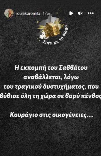 «H εκπομπή του Σαββάτου αναβάλλεται, λόγω του τραγικού δυστυχήματος που βύθισε την χώρα στο πένθος», ήταν η ανακοίνωση στον λογαριασμό της εκπομπής στο Instagram, την οποία αναδημοσίευσε και η παρουσιάστρια, Ρούλα Κορομηλά.