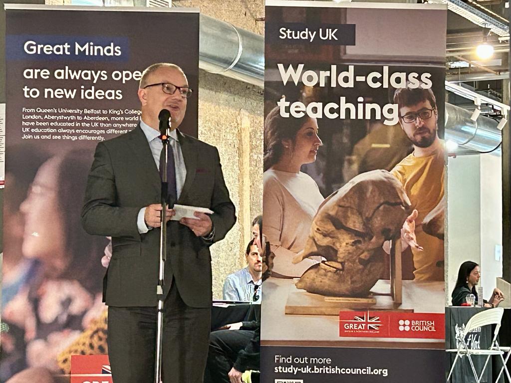 « Η εκπαίδευση αποτελεί μια εξαιρετικά σημαντική πτυχή των σχέσεων μεταξύ Ελλάδας και Ηνωμένου Βασιλείου και συμβάλλει στην καλλιέργεια ισχυρών και διαρκών ανθρώπινων δεσμών μεταξύ των χωρών μας. Πρόσφατη έρευνα του British Council καταδεικνύει ότι οι Έλληνες φοιτητές, παρά το υψηλότερο κόστος σπουδών στο Ηνωμένο Βασίλειο, εξακολουθούν να θεωρούν το Ηνωμένο Βασίλειο ως την κορυφαία επιλογή τους για σπουδές στο εξωτερικό για τα παγκοσμίως αναγνωρισμένα πανεπιστήμια, τις καινοτόμες διδακτικές προσεγγίσεις, την παγκόσμια φήμη των πτυχίων του Ηνωμένου Βασιλείου καθώς και την πρωτοπορία και αριστεία της στην έρευνα. Η εκπαίδευση στο Ηνωμένο Βασίλειο ανοίγει πόρτες, όπου κι αν βρεθείτε. Σήμερα με αυτήν την εκδήλωση, ελπίζουμε να έχουμε ανοίξει εμείς μια πόρτα για εσάς που ενδιαφέρεστε για την εκπαίδευση στο Ηνωμένο Βασίλειο, για να μάθετε περισσότερα σχετικά με τις ευκαιρίες σπουδών και τις επιλογές χρηματοδότησης που έχετε στη διάθεσή σας».